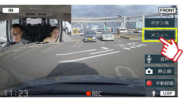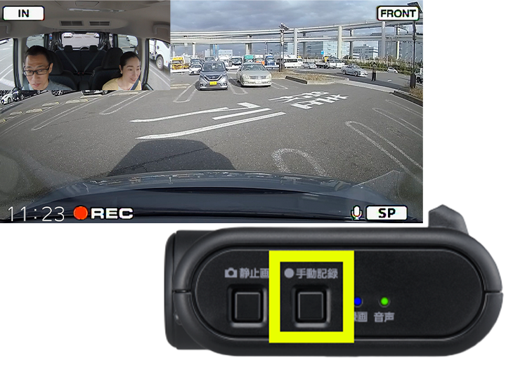 ドライブレコーダー画面を表示し、インカメラの「手動記録」ボタンを長押しします。