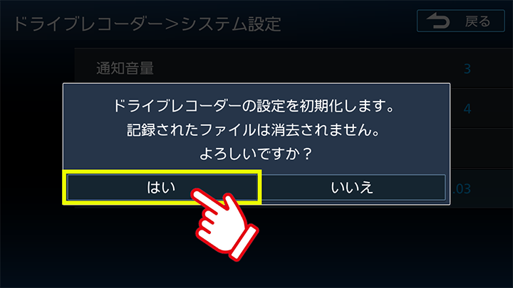 「はい」を選択し、ドライブレコーダーの初期化は完了です。