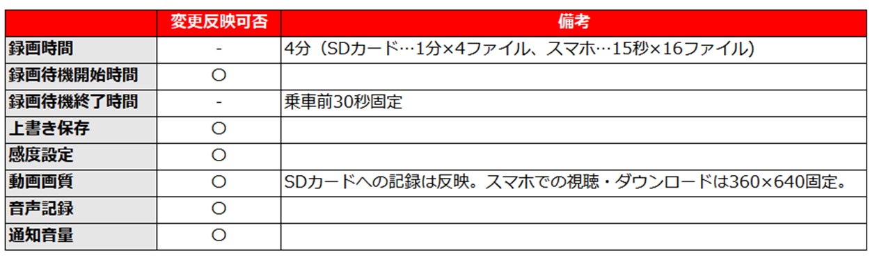 駐車みまもりサービスの駐車録画では、「録画時間」「録画待機終了時間」が固定となり変更が反映されません。