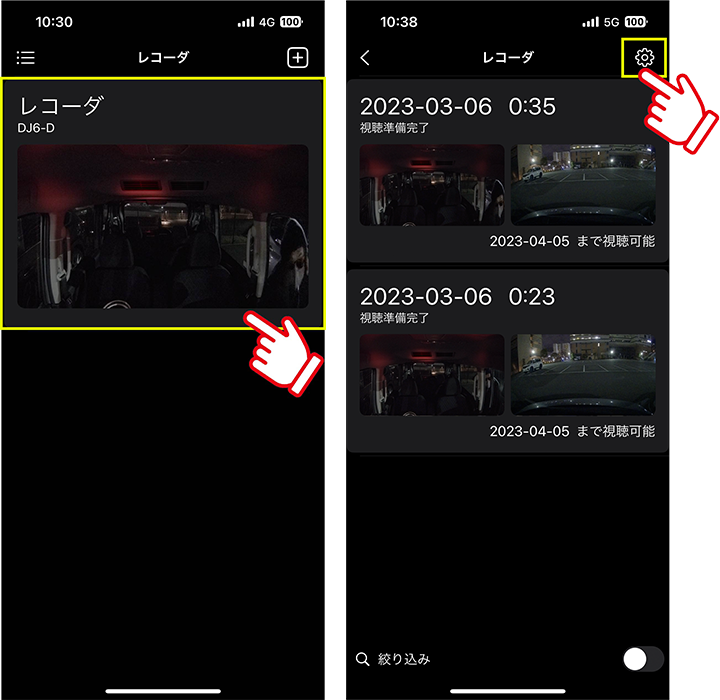 アプリTOPからドライブレコーダーを選択し、レコーダ右上の[⚙]をタップします。
