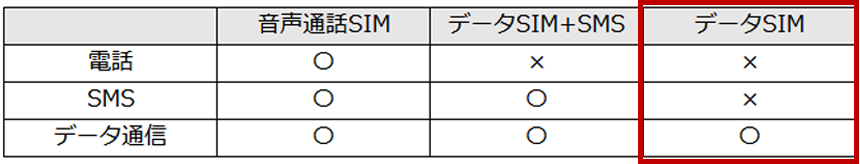 nanoSIMは用途に合わせて「音声通話SIM」「データSIM+SMS」「データSIM」の3つに分類されます。本機ではすべてのnanoSIMが使用できますが、音声通話やSMS機能は必要ありませんので、「データSIM」のご利用をお勧めいたします。