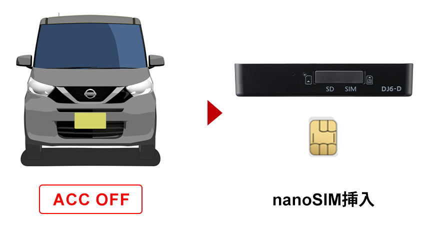 ACCをオフにして、ドライブレコーダー本体にnanoSIMを挿入します。