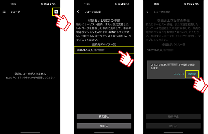 connect DRを起動し、TOP画面右上のプラスボタンをタップし、SSID「DIRECT-DJ6_D_xxxxx」または「DIRECT-DJ6_S_xxxxx」をタップ。