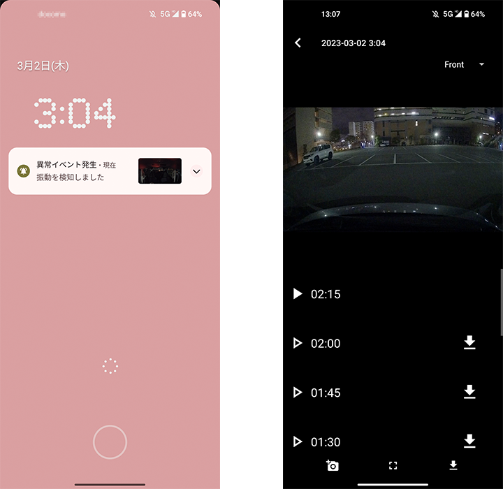 - 駐車録画が通知されることを確認する。