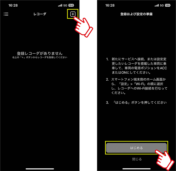 connect DRを起動し、TOP画面右上のプラスボタンをタップし、「はじめる」をタップします。
