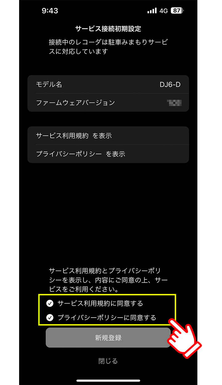「サービス利用規約」 「プライバシーポリシー」をそれぞれ表示しお読みいただいたのち、各チェックボックスをタップして、同意にチェックを付け、「新規登録」をタップします。