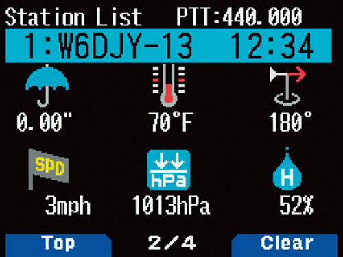 The TH-D75A is capable with a relative direction display that enables you to see at a glance real-time GPS information or pre-set information for your own station, and the distance/direction/heading/speed of other stations. It is now easier to recognize any position and heading relationships with your own station. Weather station information can be displayed in color for rainfall, temperature, wind direction/speed, barometric pressure, and humidity data.