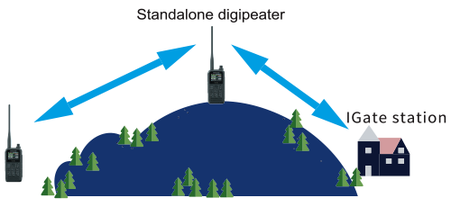 The TH-D75A is capable of operating as a standalone digipeater station. It can be configured as a temporary relay station in a variety of scenarios, such as outdoors, enabling for support data communications from locations such as basins surrounded by mountains.